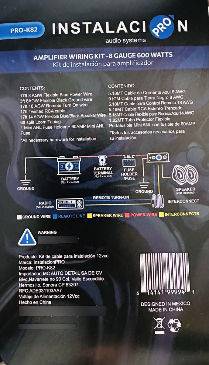 Kit de Instalación para amplificador Calibre 8Contenido:-5.18mt Cable de Corriente Azul 8 AWG-91cm Cable para Tierra Negro 8 AWG-5.18mt Cable para Remoto 18 AWG-5.18mt Cable RCA Estéreo Trenzado-5.18mt Cable flexible para Bocina Azul/Negro 14 AWG-1.82mt Tubo Protector Flexible-Portafusible mini ANL con Fusible mini ANL 60 AMP-Terminales de ojo calibre 8*Todos los accesorios necesarios para su instalación.