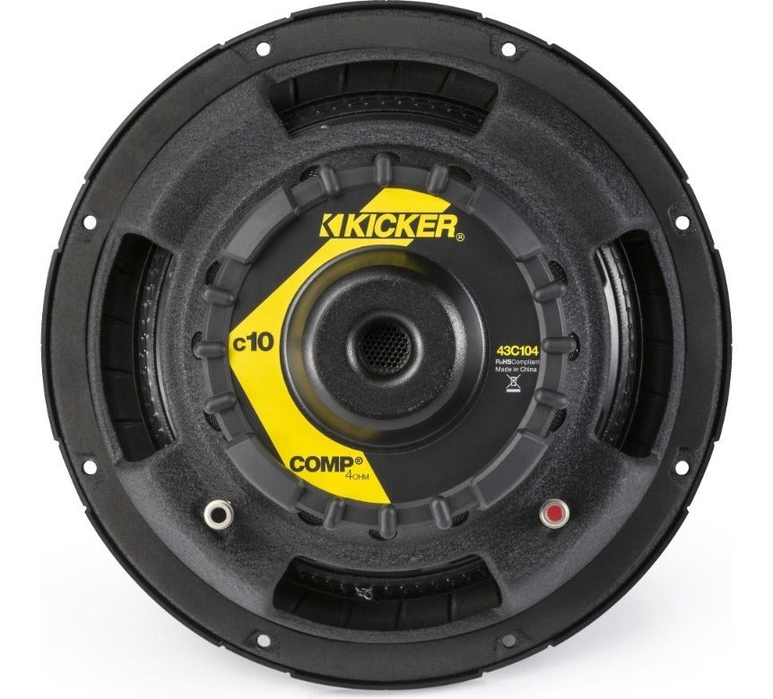 Subwoofer Kicker 43c104 10 Pulgadas 300w Max Bobina Sencilla:- Subwoofer de 10' y 4 Ohms- Cono de polipropileno moldeado por inyección- Envolvente de espuma acanalada- Maneja hasta 150 vatios RMS- Manejo de potencia máxima: 300 vatios- Respuesta de frecuencia: 30-500 Hz- Sensibilidad: 86.2 dB- Profundidad de montaje superior: 5'- Volumen de caja sellada: 1.0 - 2.4 pies cúbicos- Volumen de la caja portada: 1.24 - 1.75 pies cúbicos- Rejilla no incluida