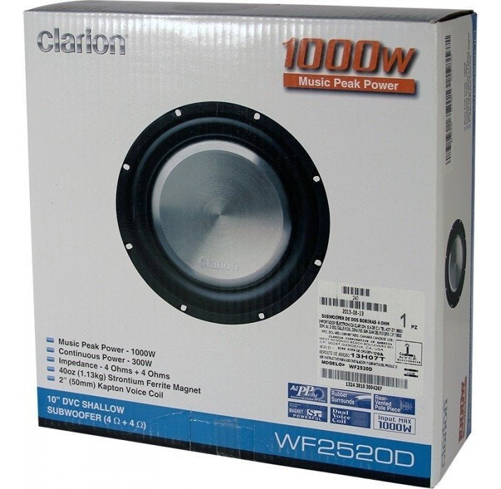 Subwoofer Plano Clarion 10 Pulgadas Wf2520d 1000w Max Color NegroEste subwoofer de 10 pulgadas y color negro tiene una manipulación de potencia máxima de 1000 watts y una manipulación de potencia continua de 300 watts. Cuenta con bocinas de voz de aluminio pesadas duales de 4 ohmios y un cubre polvo de IPP de aluminio. Su cono SPP está reforzado y tiene una cubierta de goma de nitrilo-butadieno extruido.Además, posee una amplia pieza polar posterior ventilada y una araña de algodón lineal con oropel trenzado integrado. Su canastilla está estampada y recubierta en polvo de acero.En cuanto a sus especificaciones técnicas, tiene una respuesta de frecuencia de 40-1000 Hz, una eficiencia de 83 dB/W/m y una impedancia de 4 ohms duales. Sus dimensiones exteriores son de 10-21/32 pulgadas y su profundidad de montaje es de 2-25/32 pulgadas. El volumen de la caja es de 0,4 a 0,6 pies.